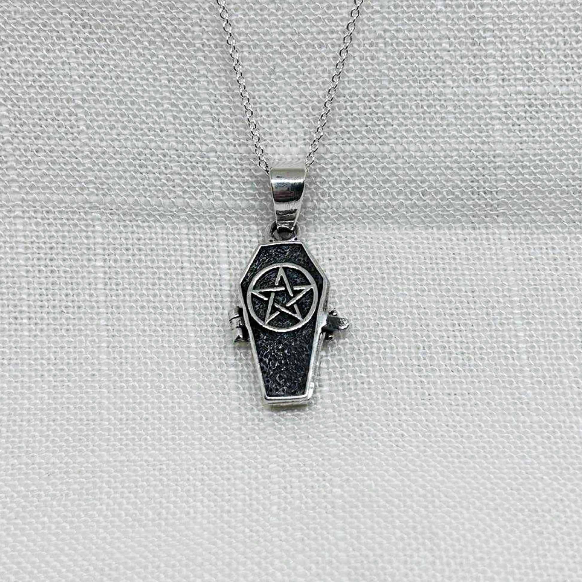 Made from .925 silver, this gothic style coffin opens up to find a skeleton laying inside. The locket has been oxidised to show off the details of the pentacle on the outside and skeleton within.